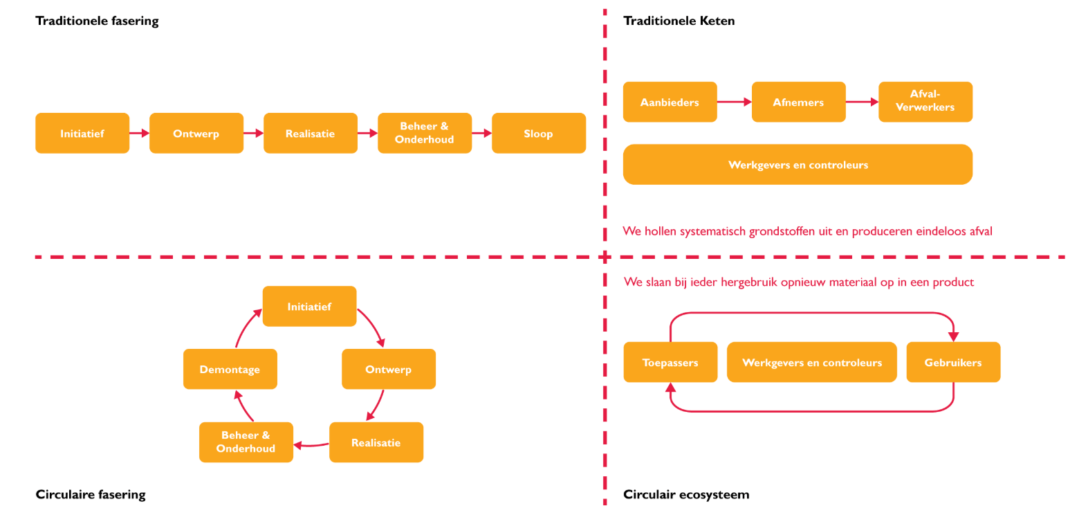 Het verschil tussen een lineair en een circulair bouwproces illustreren we met figuur 6. De fasering in een traditioneel, lineair proces is opgedeeld in blokken met elk een afgebakend begin en eind. In een lineair ontwerpproces is de sloopfase echter zelden vertegenwoordigd. Het toepassingsgebied van het ontwerp houdt vaak op bij keuzes over beheer en onderhoud of loopt in het slechtste geval tot aan de afronding van de bouwfase (oplevering).