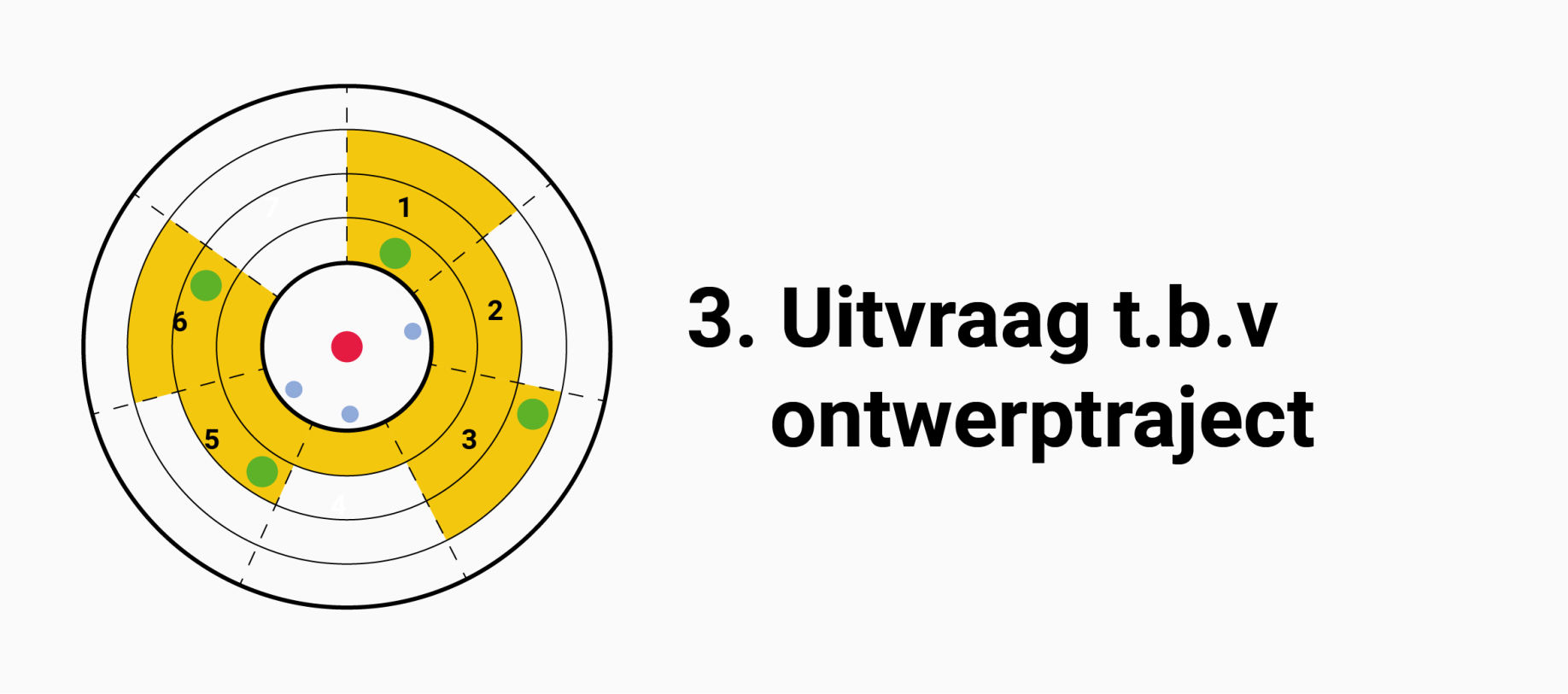 De oranje segmenten laten zien wat het belang is van de ontwerpstrategie binnen de maatstrategie in een project. De rode stip in het midden is de centrale besluitvormingsrol. De blauwe stippen daaromheen zijn de leden van het ontwerpteam. De groene stippen zijn kennisleverende partijen, die het ontwerpteam van informatie voorzien.
