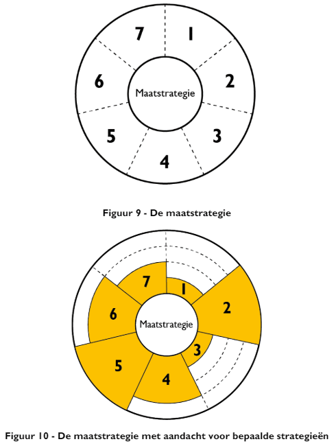 De strategie Preventie komt tweemaal voor, omdat de grootste impact te maken valt door zo min mogelijk grondstoffen aan te spreken bij het realiseren van de bouwopgave. Dit kan vroeg in het ontwerpproces, maar ook later in het proces, en op verschillende schaalniveaus. Paragraaf 6.4.1 Preventie geeft hier meer uitleg over. De ontwerpstrategieën zijn het resultaat van een inventarisatie van verschillende bronnen2. Samen vormen ze een compleet beeld van de mogelijke circulaire ontwerpkeuzes. Elke strategie wordt in een paragraaf omschreven en van suggesties voor praktische invulling en voorbeelden voorzien. Daarnaast wordt de relatie tot andere strategieën toegelicht. Ze dragen ieder in meer of mindere mate bij aan de drie doelen van circulariteit van Platform CB’23: het beschermen van grondstofvoorraden, het beschermen van het milieu en het beschermen van bestaande waarde. Een maatstrategie (figuur 9) is een combinatie van relevante ontwerpstrategieën die een ontwerpteam gedurende een specifiek project samenstelt. De grootte van de segmenten geeft aan in welke mate een strategie binnen een project van toepassing is (figuur 10). Gedurende opeenvolgende projectfasen kan de maatstrategie worden aangepast. In de samenwerkingsschijf uit hoofdstuk 5 ‘Rollen en Samenwerking’ worden deze opeenvolgende maatstrategieën gecombineerd.